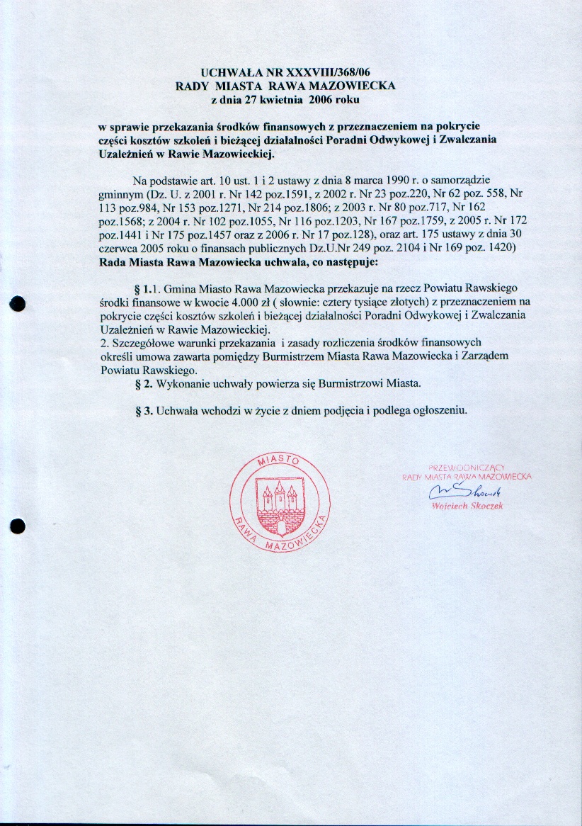 UCHWAŁA NR XXXVIII/368/06 z dnia 27 kwietnia 2006 r. w sprawie przekazania środków finansowych z przeznaczeniem na pokrycie części kosztów szkoleń i bieżącej działalności Poradni Odwykowej i Zwalczania Uzależnień w Rawie Mazowieckiej