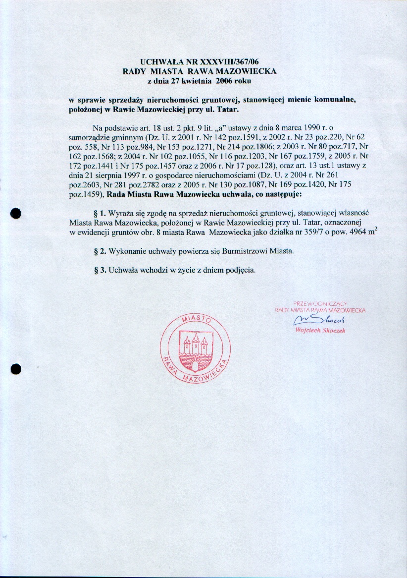 UCHWAŁA NR XXXVIII/367/06 z dnia 27 kwietnia 2006 r. w sprawie sprzedaży nieruchomości gruntowej, stanowiącej mienie komunalne, położonej w Rawie Mazowieckiej przy ul. Tatar