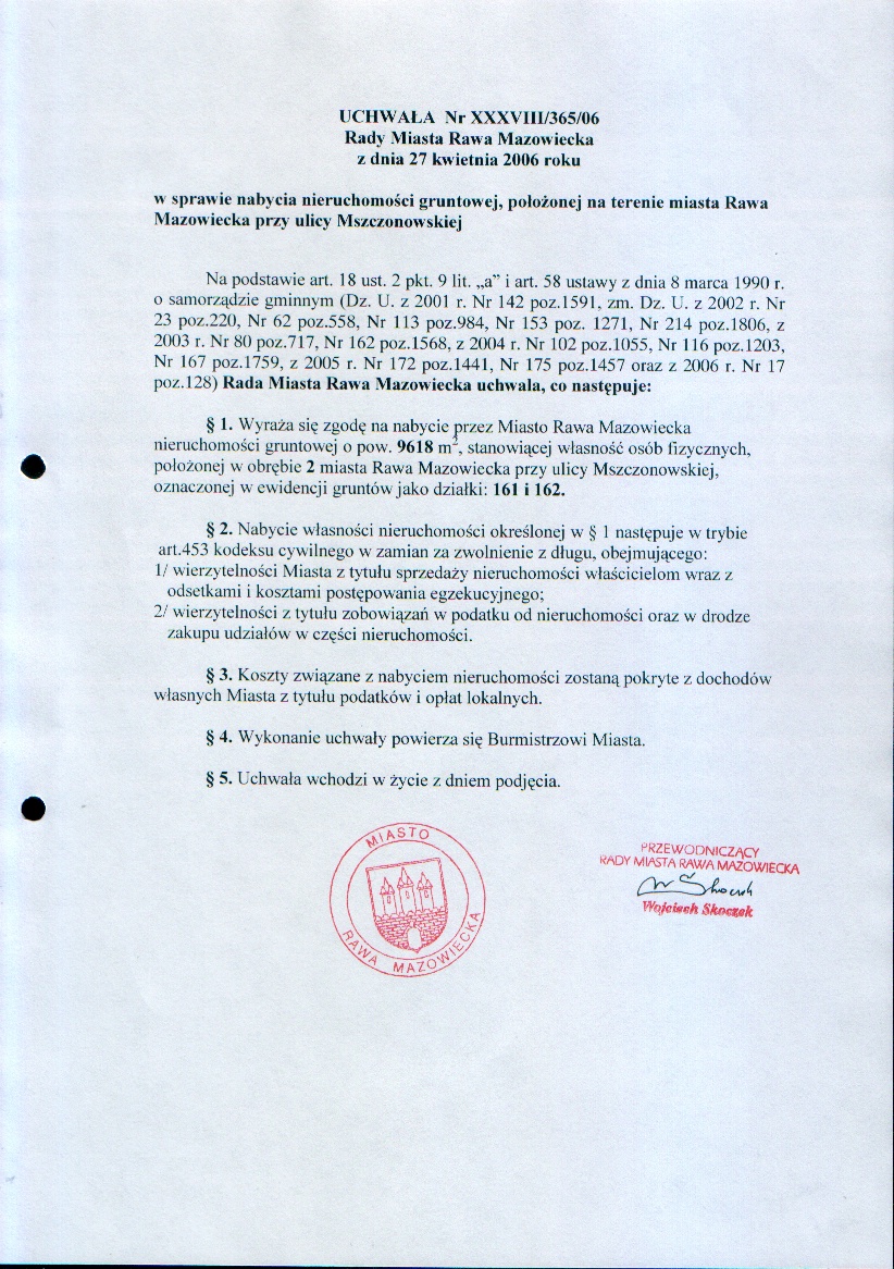 UCHWAŁA NR XXXVIII/365/06 z dnia 27 kwietnia 2006 r. w sprawie nabycia nieruchomości gruntowej, położonej na terenie miasta Rawa Mazowiecka przy ulicy Mszczonowskiej