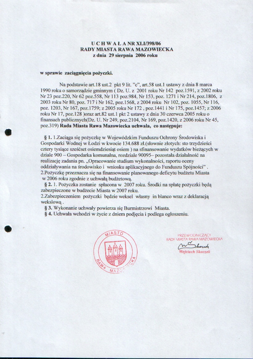 UCHWAŁA NR XLI/398/06 z dnia 29 sierpnia 2006 r. w sprawie zaciągnięcia pożyczki