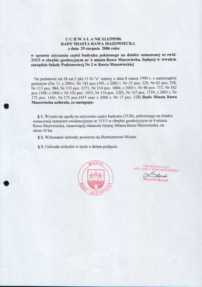 UCHWAŁA NR XLI/395/06 z dnia 29 sierpnia 2006 r. w sprawie użyczenia części budynku położonego na działce oznaczonej nr ewid.315/3 w obrębie geodezyjnym nr4 miasta Rawa Mazowiecka, będącej w trwałym zarządzie Szkoły Podstawowej Nr 2 w Rawie Mazowieckiej