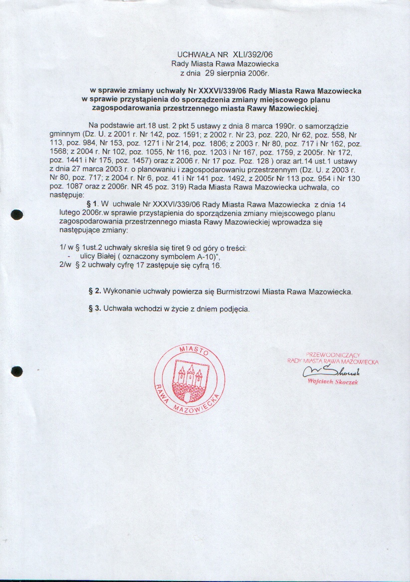 UCHWAŁA NR XLI/392/06 z dnia 29 sierpnia 2006 r. w sprawie zmiany uchwały Nr XXXVI/339/06 Rady Miasta Rawa Mazowiecka w sprawie przystąpienia do sporządzenia zmiany miejscowego planu zagospodarowania przestrzennego miasta Rawa Mazowiecka